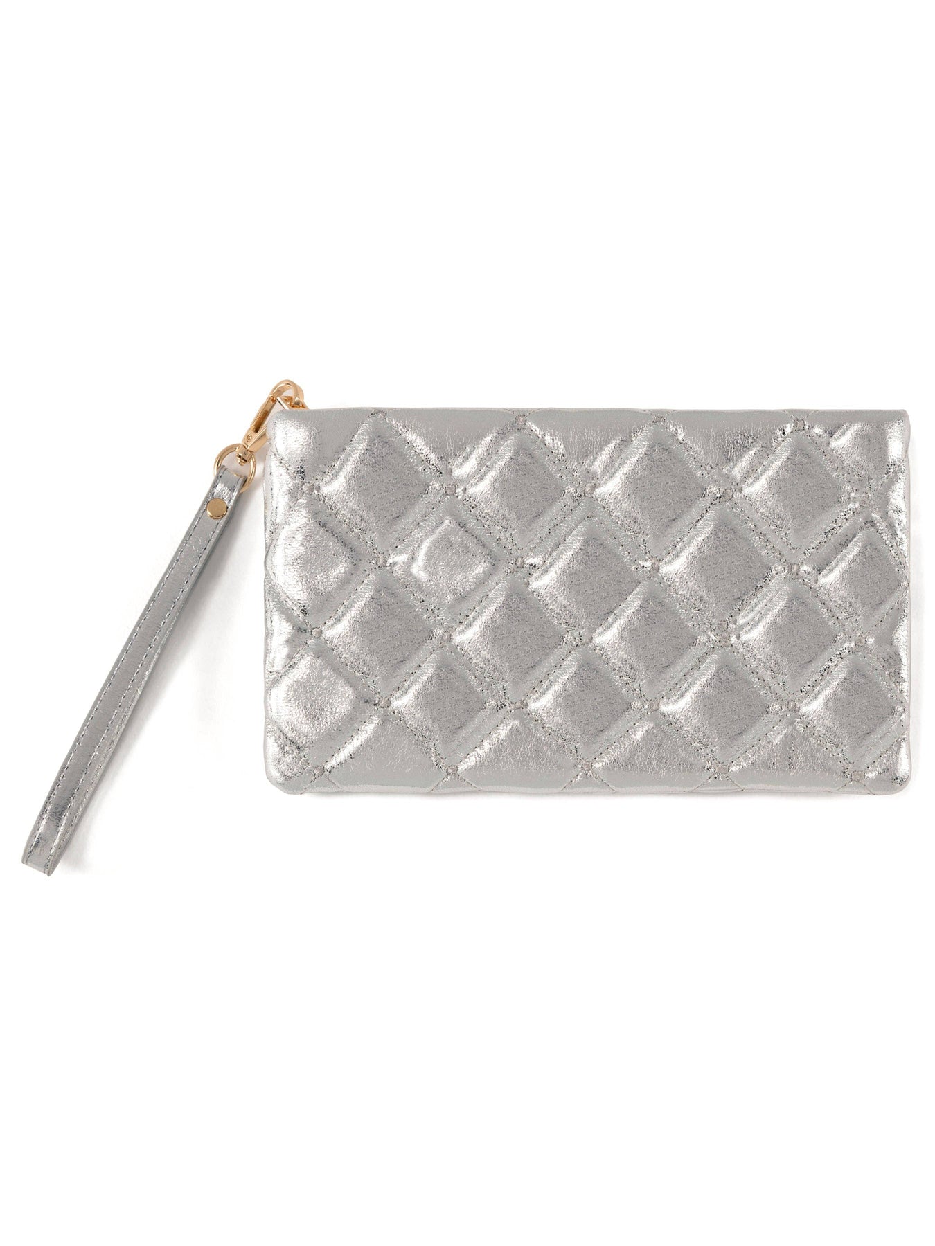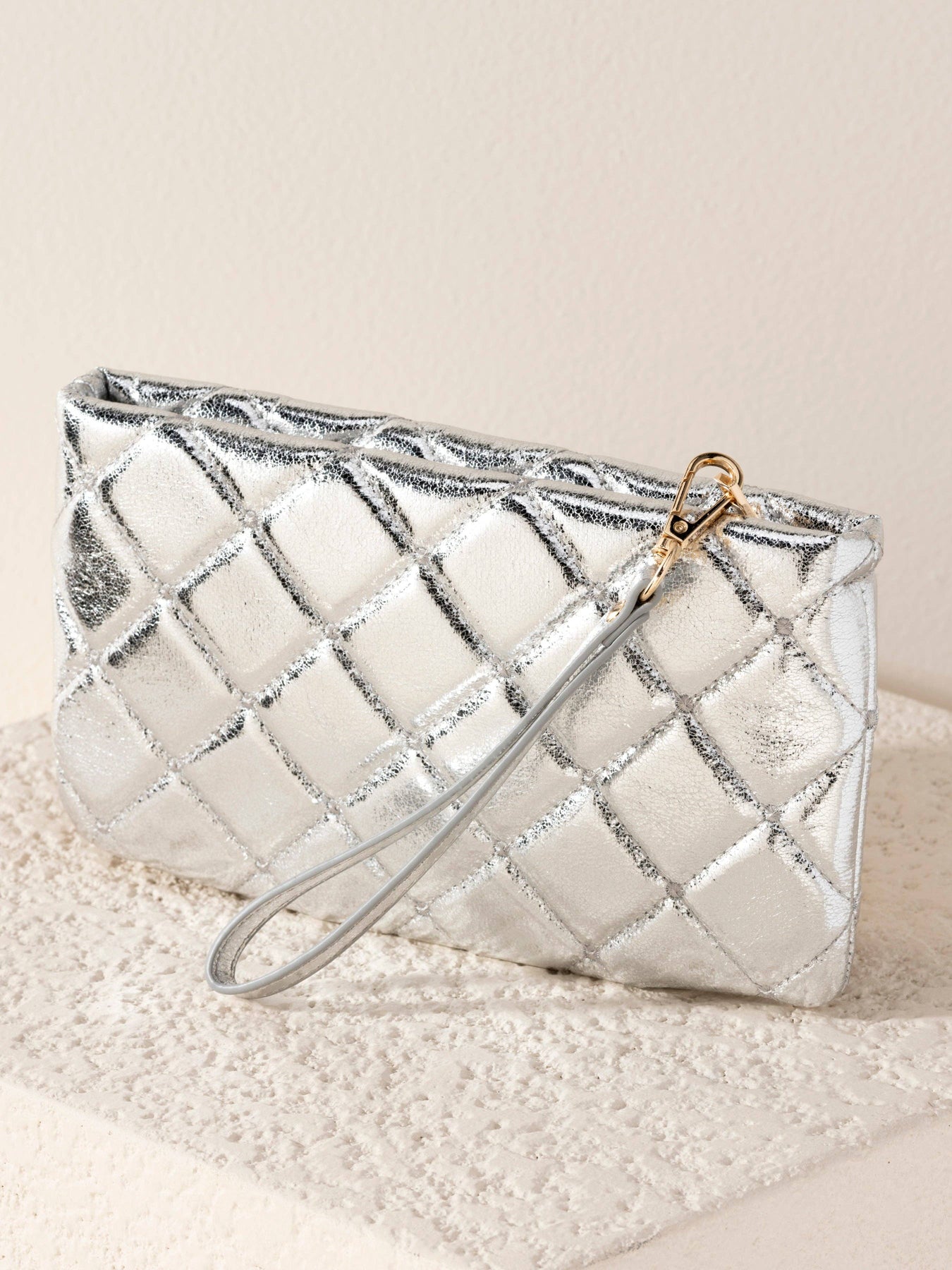 The ultimate mix of function and fashion. This metallic silver wristlet keeps your essentials close while adding a stylish shimmer to your outfit.