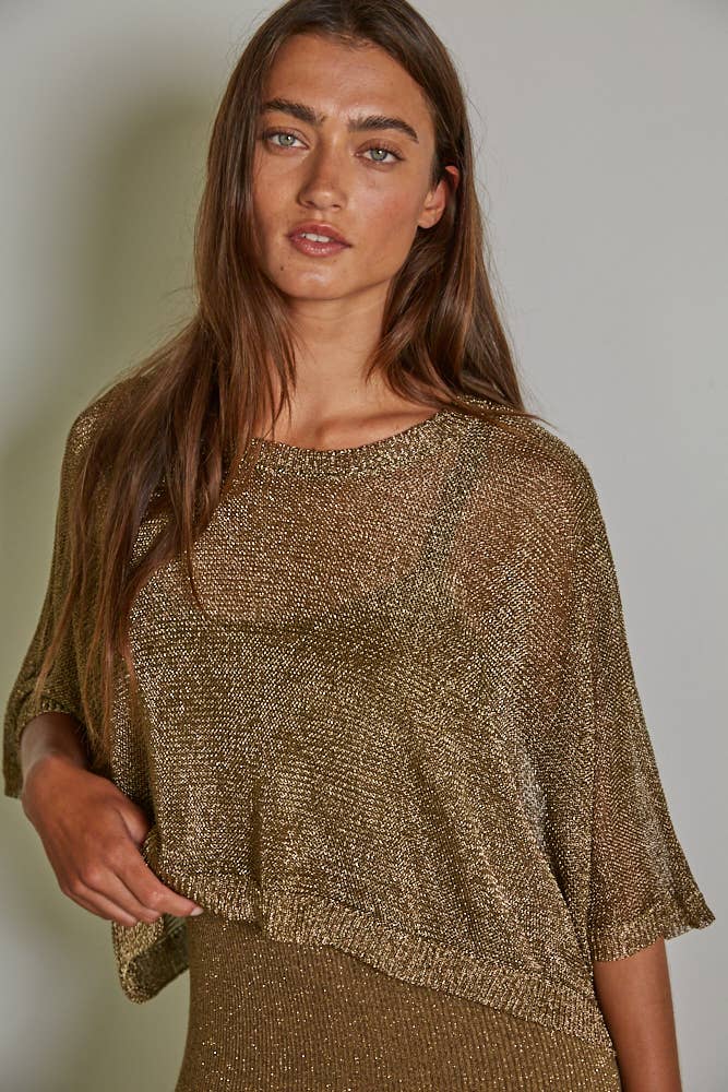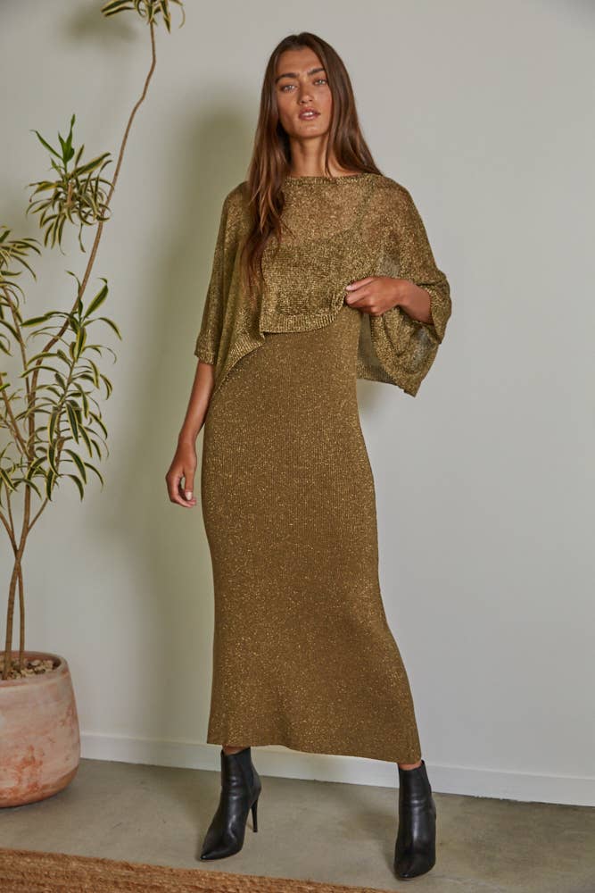 Knit Polyester Sweater Lurex Crew Neck Short Sleeve Crop Top. Sold as set with lurex midi dress
