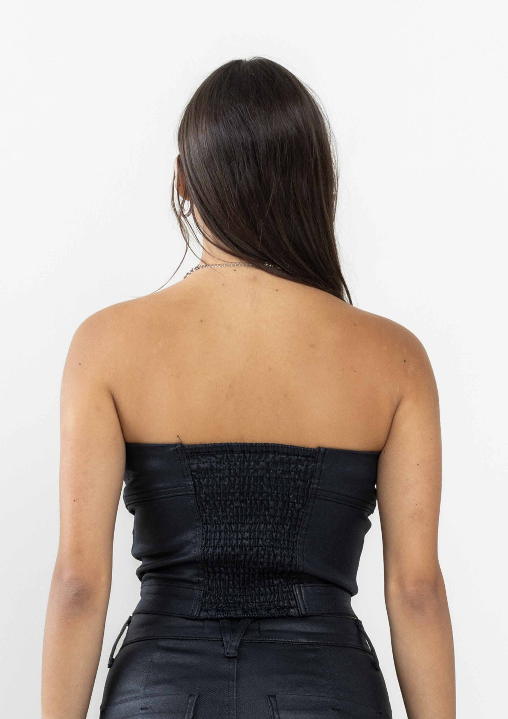 Unleash your sleek seasonal style with this strapless coated top, designed with back smocking for a comfortable fit and a front button-up closure for an edgy finish. Pair it with the matching coated denim for a head-to-toe look that’s polished, bold, and ready for fall nights out. Coordinating flare jeans also available and sold separately.