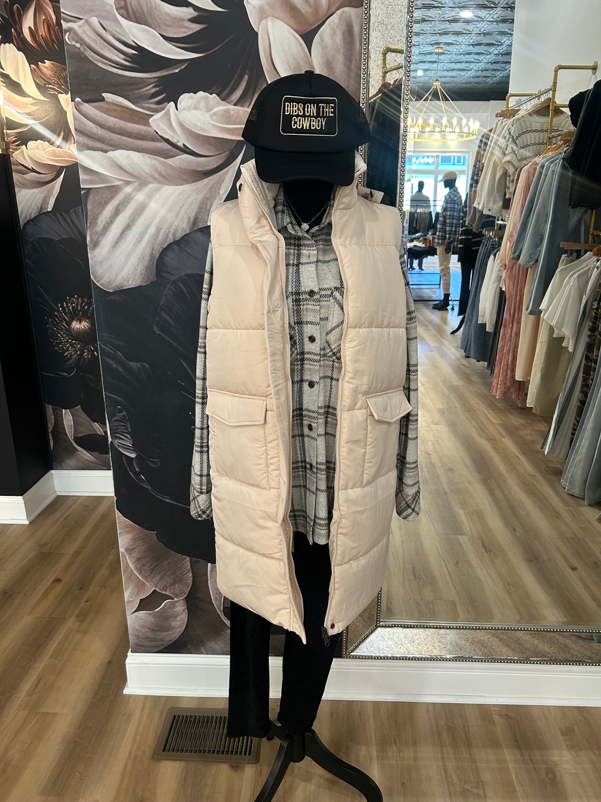 Black polyester trucker hat with tan embroidered text, "Dibs On The Cowboy"
