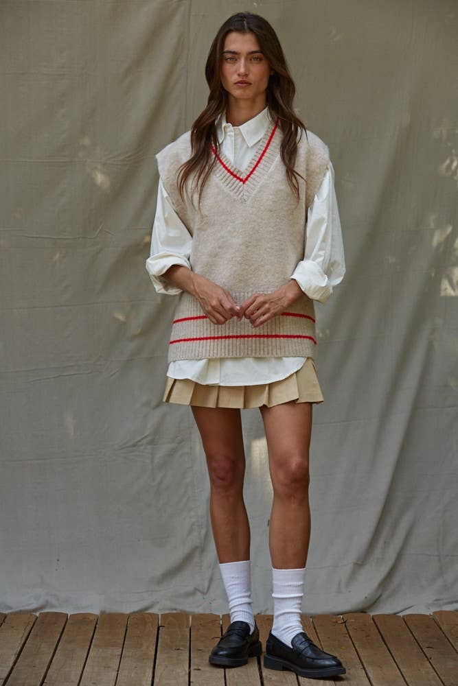 Effortlessly chic and perfect for layering, this sleeveless knit vest features a flattering V-neckline and a subtle printed stripe detail for added style. Crafted from a soft acrylic-polyester-spandex blend, it offers comfort, stretch, and versatility—ideal over a blouse, turtleneck, or paired with your favorite jeans or skirts.