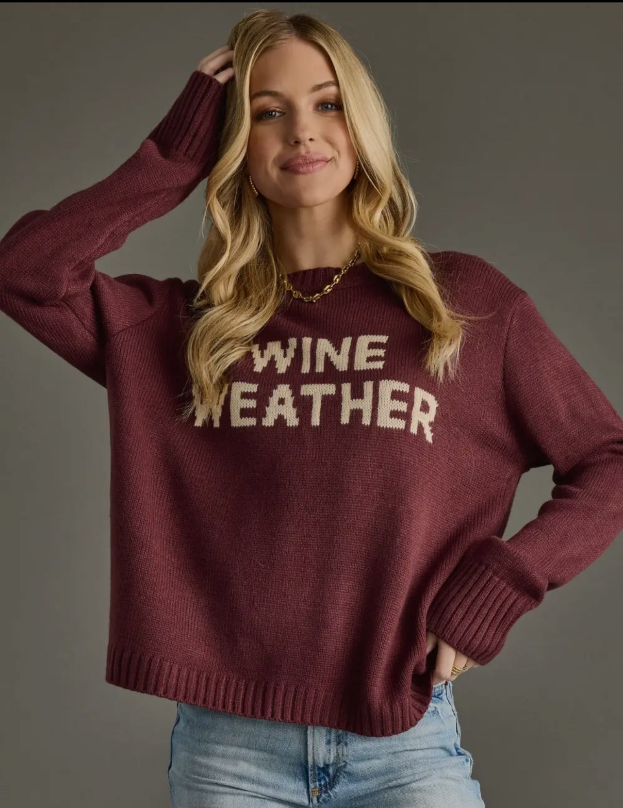 It’s officially Wine Weather! This cozy knit in a rich wine shade with tan lettering is a fall must-have. Pair it with jeans and boots for a look worth toasting to! Elevate this look with our tan longline puffer vest!